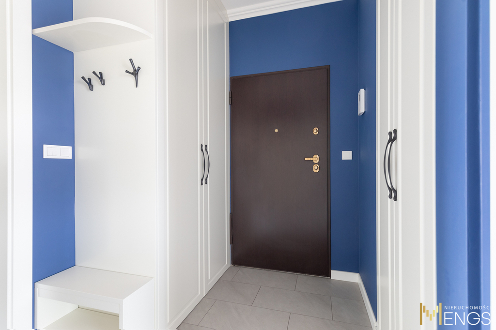 Miejsce w garażu podziemnym wliczone jest w cenę najmu. W przedpokoju znajdują się trzy pojemne szafy wnękowe.